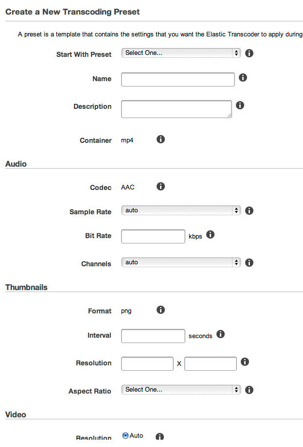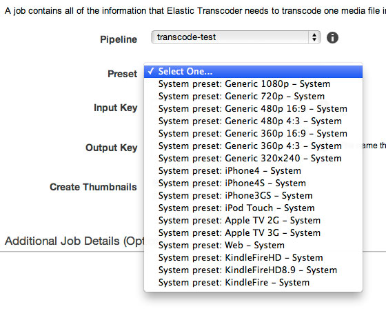 Quelques pré-requis tout d’abord : création d’un compte Amazon Web Services, ouverture d’un espace de Stockage S3 et création d’un profil Elastic transcoder.